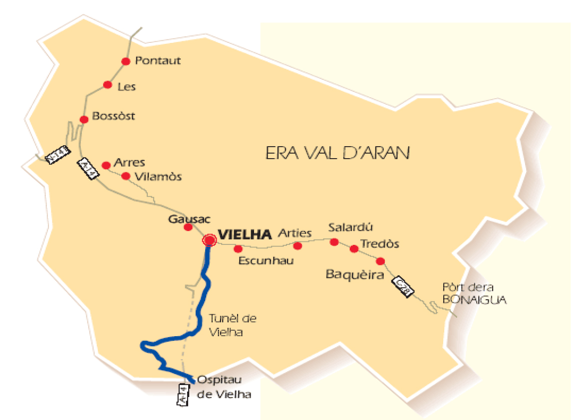 Le Val d’Aran est bordé au nord et à l’ouest par l’ Ariège et la Haute Garonne, ainsi que par l’Aragon( Bénasque)); au sud avec l’Alta Ribagorza et l’Aragon, à l’est avec le Pallars Sobirà.