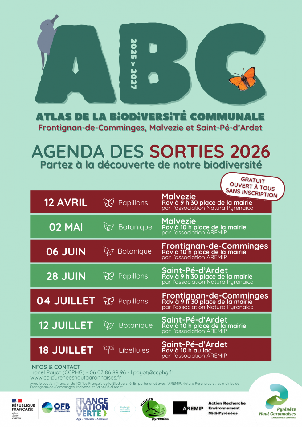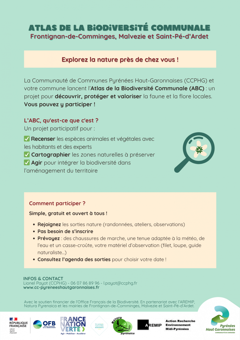 La CCPHG, en partenariat avec les communes de Frontignan-de-Comminges, Malvezie et Saint-Pé-d'Ardet, collaborent pour la préservation de notre patrimoine naturel en lançant un Atlas de la Biodiversité Communale (ABC). Pendant trois ans, nous allons recenser la faune et la flore locales, et vous pouvez y participer.