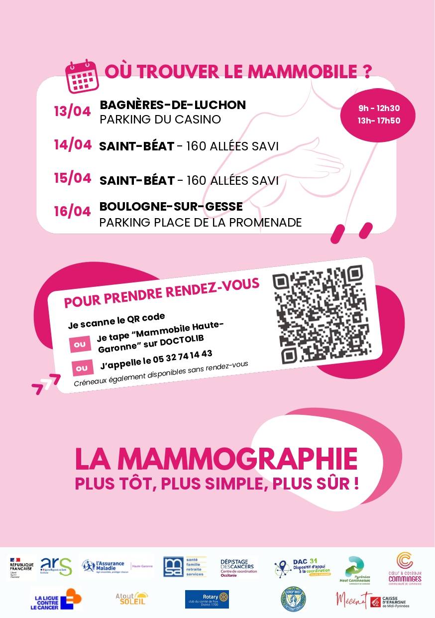Un camion dédié au dépistage du cancer du sein, surnommé le Mammobile, fait étape à Luchon et à Saint-Béat-Lez mi-avril. Les femmes de 50 à 74 ans peuvent bénéficier d'un examen de contrôle, sans ordonnance.