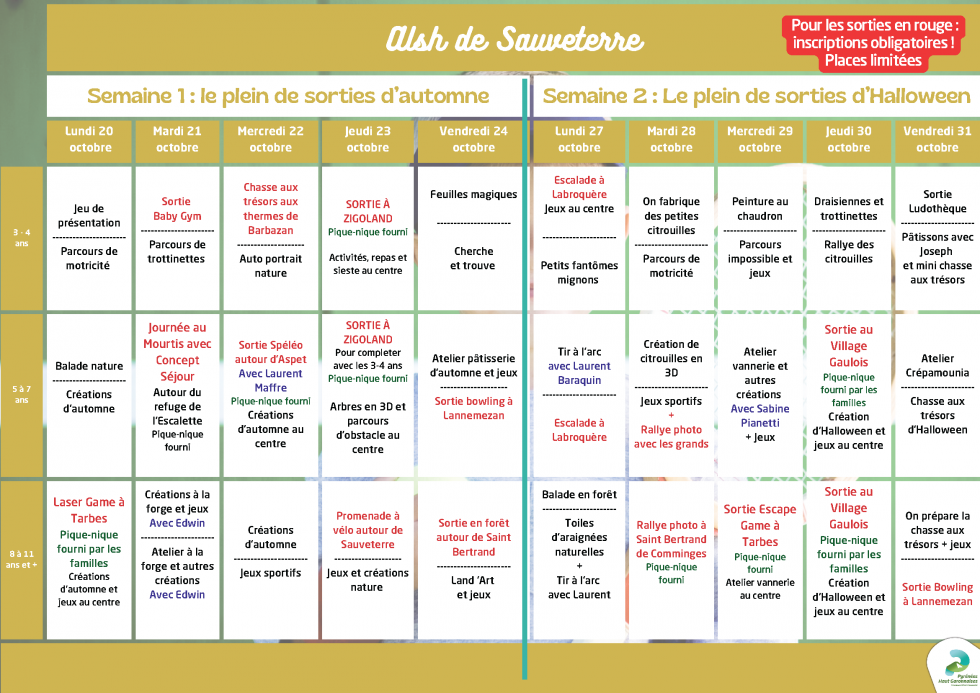 * sur certaines sorties les horaires seront précisés.