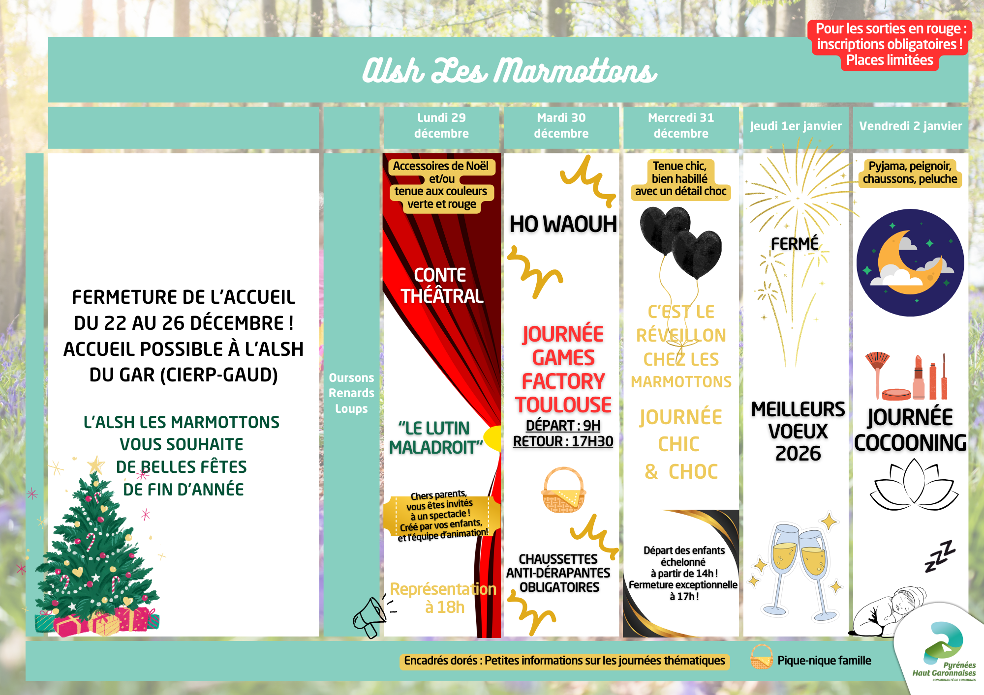 - Période : vacances scolaires (sauf vacances de Noël)