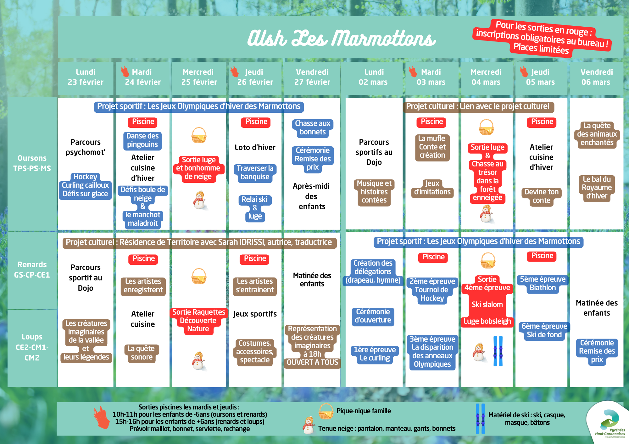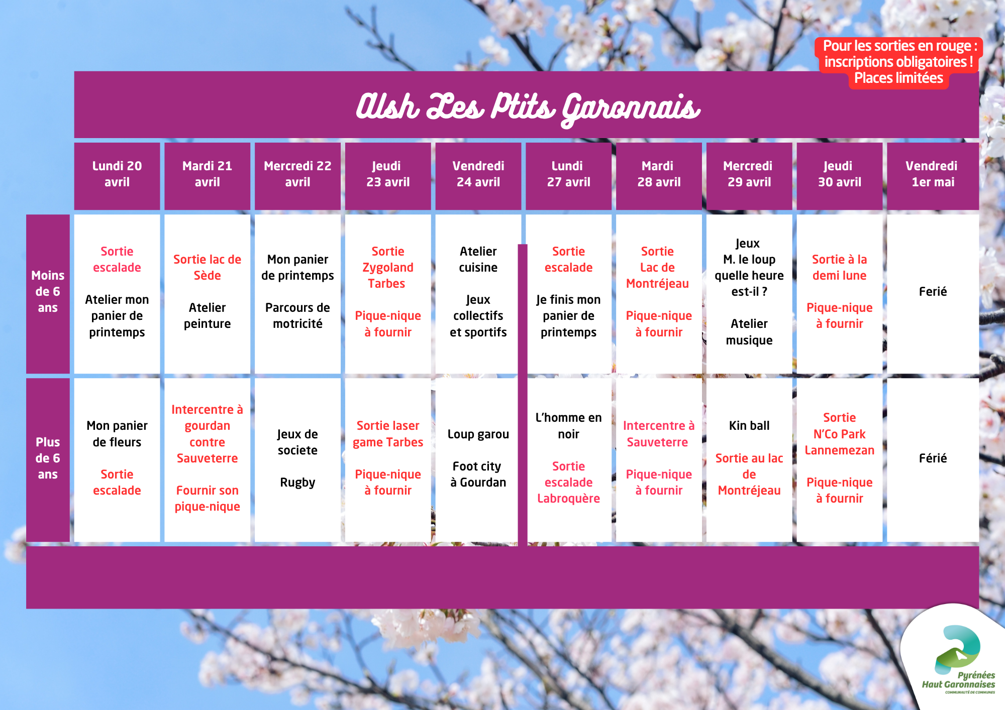 Pour les activités ayant un nombre de places limitées (indiquées en rouge dans les programmes), nous vous remercions de bien penser à inscrire vos enfants sur la fiche de réservation. S’il n’y a plus de place, une animation sera proposée au centre de loisirs.